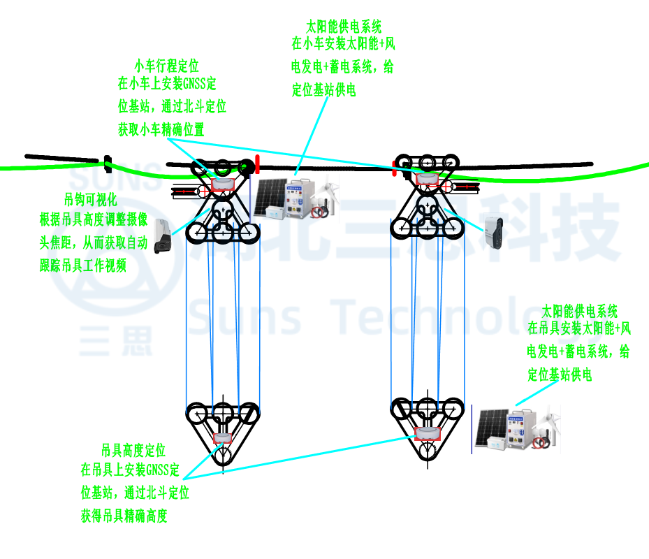 吊鉤可視化系統(tǒng)通過在小車上安裝向下照射的高清攝像頭照射吊具,攝像頭通過安裝在小車上的太陽能+風(fēng)電供電系統(tǒng)持續(xù)提供電能,可實(shí)現(xiàn)24小時(shí)不間斷監(jiān)控,夜間也可實(shí)現(xiàn)對(duì)吊具的監(jiān)控。