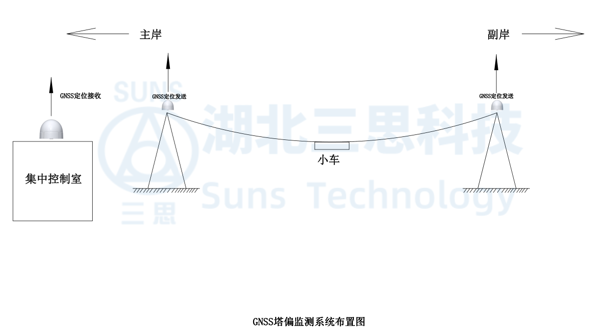 通過在塔頂安裝GNSS北斗定位基站來實(shí)現(xiàn)塔身偏移監(jiān)測(cè);通過安裝在集中控制室的定位主站接收到塔頂傳來的信號(hào)給PLC采集器,PLC系統(tǒng)計(jì)算出塔身偏移的位移數(shù)據(jù)并顯示在集中監(jiān)控系統(tǒng)上。